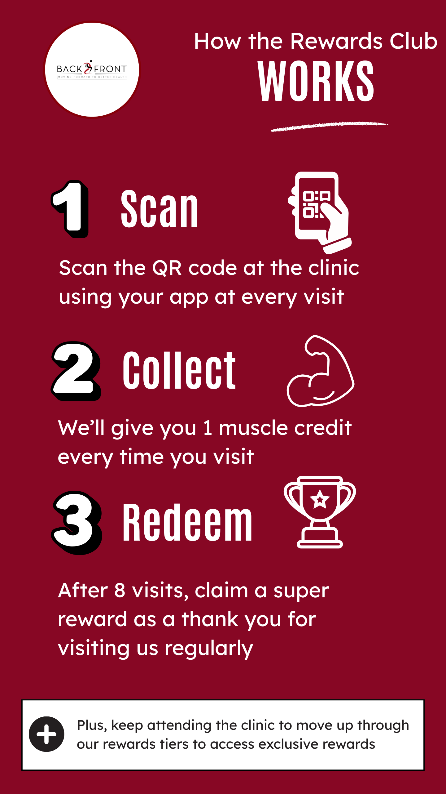 Our Back2Front Rewards Club is our way of saying thank you for your loyalty and commitment to your health. Every time you visit the clinic, you’ll earn 1 Muscle Credit by simply scanning the QR code at reception using the app.